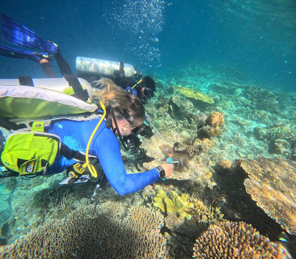 Hingga kuartal ketiga saja (hingga September 2025), di tengah tantangan cuaca dan kekurangan tenaga keja, sebanyak 9.840 fragmen yang berasal dari 42 jenis karang dari 23 family berhasil ditanam. Ini bukan pekerjaan mudah. Setiap fragmen diikat manual, setiap meter kawat dibentangkan di kedalaman 5-15 meter, dan setiap jengkal pertumbuhan dipantau secara berkala dan diinput kedalam logbook pada aplikasi “My Survei 123”.